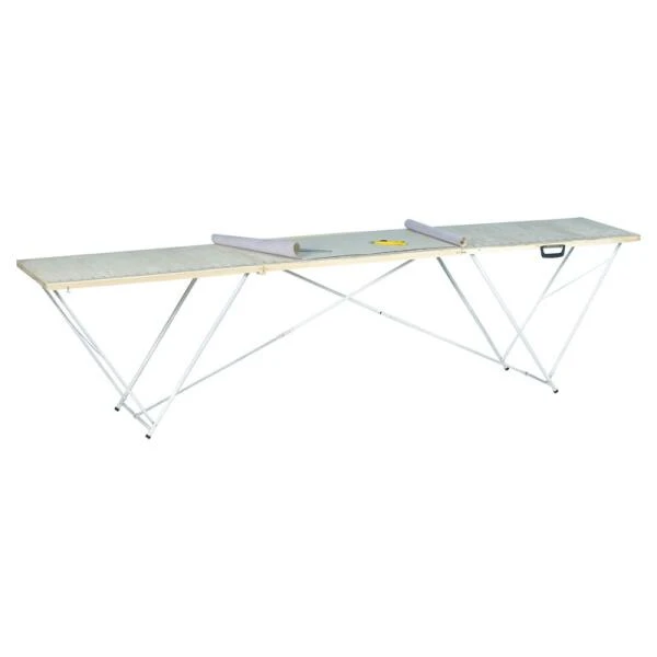Professionele behangtafel met houten blad. De tafel heeft een glad, effen oppervlak met maataanduiding in centimeter. Het gaat om een triplex bovenblad.