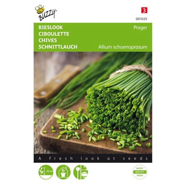 Bieslook (Allium schoenoprasum) is een gewas dat jaren achtereen kan blijven staan. Oorsprong ligt vermoedelijk in Siberie en Oost-Azië. In Nederland hebben we bieslook leren kennen via Italië. Het groeit goed op alle grondsoorten. Er zijn meer bekende allium soorten, zoals de grove bieslook (allium fistulosum artikel 01030), chinese bieslook-knoflook (allium tuberosum artikel 01028) en natuurlijk de ui (allium cepa) en prei (allium porrum). Bieslook heeft een fijne, delicate smaak. Bieslookstengels zijn lang, smal en grasachtig. Als ze niet worden afgeknipt krijgen ze in het tweede jaar prachtige violet-blauwe bloemen. Daarom worden ze ook vaak als borderplanten toegepast.
