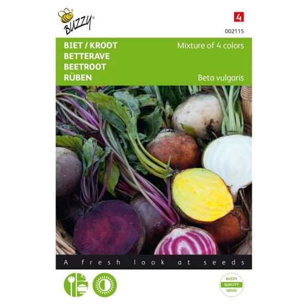 Een mix van bieten in 4 verschillende kleuren: bieten Albina Vereduna, Burpees Golden, Kogel 2 en Chioggia. Een mengsel dat kleur geeft aan gerechten. Bieten zijn bovendien zeer gezond en ook lekker om te verwerken in groentensap of in smoothies. Ook geschikt als mini-bietjes.