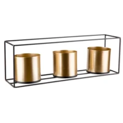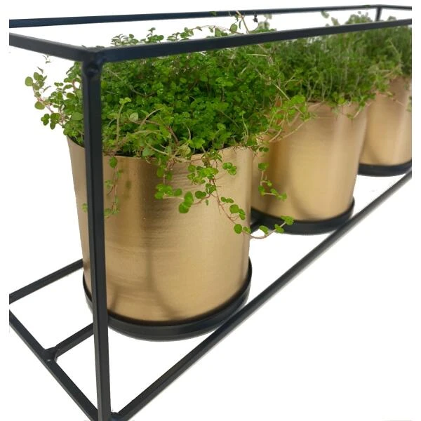 Binnenin de rechthoekige houder in metaal staan goudkleurige bloempotten. Ze rusten op de houder en zijn makkelijk uitneembaar. Aangezien ze niet rechtstreeks op de tafel staan, hoef je geen schrik te hebben voor vochtvlekken op de tafel.