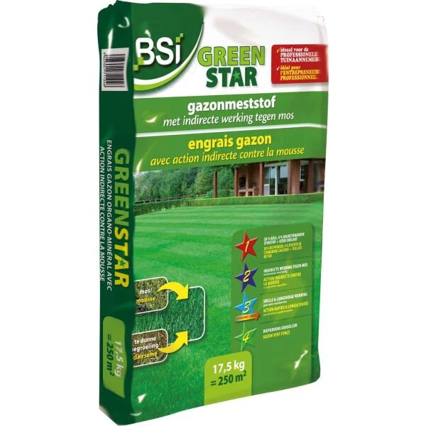 Green Star zorgt voor een optimale groei van het gras waardoor mos wordt onderdrukt. Het product maakt verticuteren overbodig, de graszode wordt dicht, zacht en vol.