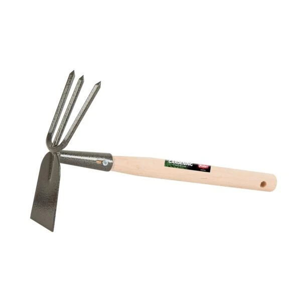 De multifunctionele hark is voorzien van drie tanden en een recht blad. Met deze onkruidwieder kan je de grond op kleine tuinoppervlakken of in bloembakken makkelijk bewerken. De onkruidwieder is ook voorzien van een ophangoog aan het uiteinde van de steel. Zo kan je dit handige gereedschap netjes opbergen in jouw tuinhuis.