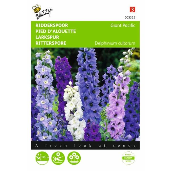 Meerjarige riddersporen die ca. 150 cm hoog worden in een fraai kleuren mengsel. De planten bloeien in blauwe, lila, roze en witte tinten. Prachtig om in de border te verwerken en schitterend op de vaas. Ook geschikt als snijbloem.