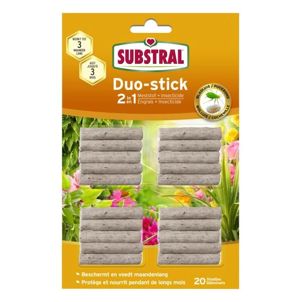 Substral DUO-STICK bevrijdt je kamer- en terrasplanten van allerlei plagen zoals trips, bladluizen, witte vlieg, dop-, schild- en wolluizen. Je planten worden bovendien beschermd voor nieuwe plagen en dat tot wel 3 maanden lang. Bij aantasting door bladluizen is er al zichtbaar resultaat na 1-3 dagen, bij witte vlieg na 5-6 dagen en bij andere plagen na ca. 2 weken.