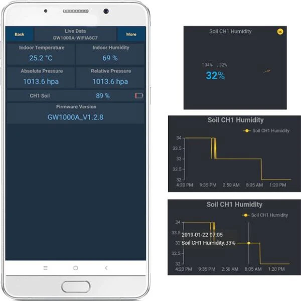 Installeer de Gateway dichtbij uw Wifi-router en download op je gsm of tablet de APP WS View (gratis). De Gateway heeft een ingebouwde sensor voor het meten van temperatuur, vochtigheid en luchtdruk. Het toestel kan tot 8 bodemvochtsensoren ontvangen. De sensor is geschikt om zowel binnen als buiten te gebruiken tot een afstand van 100 meter tussen de Gateway en de sensor.