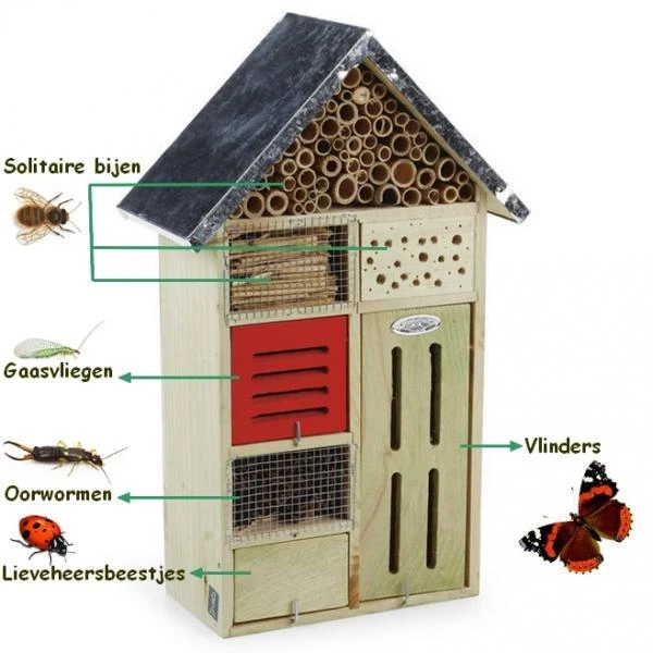 Het rode compartiment biedt bescherming en huisvesting aan groene gaasvliegen, lieveheersbeestjes en oorwormen. Het zijn allen echte ongediertebestrijders; ze eten bladluizen en spinmijten. De rode kleur van de deur zal in het bijzonder de groene gaasvliegen aantrekken. Vul het compartiment deels met stro, zodat deze insecten vanaf september tot aan het begin van april kunnen overwinteren.
