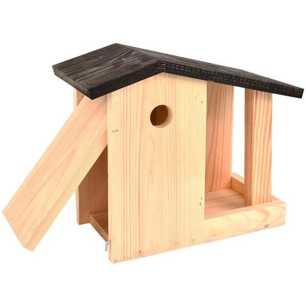 Handige twee in één nestkast met voedertafel geschikt voor tal van kleine tuinvogels. Dit naturel houten vogelhuisje heeft een invliegopening van 32 mm, uitermate geschikt voor de koolmees. Ook andere tuinvogels kunnen deze kast bewonen waaronder de huismus, ringmus of de kleinere pimpelmees.