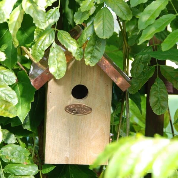 In deze fraaie nestkast met koperen dak zal de winterkoning zich meteen thuis voelen. Het vogelhuisje van Esschert design valt ook in de smaak bij koolmees, pimpelmees, mus en bonte vliegenvanger. In de winter bewijst het huisje vaak goede diensten voor de vogels om te schuilen tegen het barre weer.