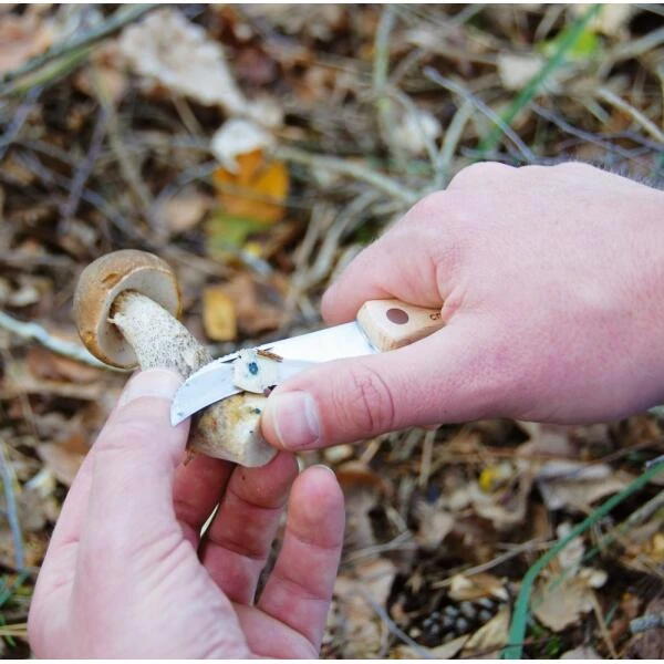 Inklapbaar paddenstoelmes met een speciaal ontworpen gebogen bladvorm om een nauwkeurige snede te maken aan de uiteinde van de steel van paddenstoelen, waarmee je voorkomt dat het delicate mycelium (het netwerk van alle draden in de aarde) wordt verstoord.