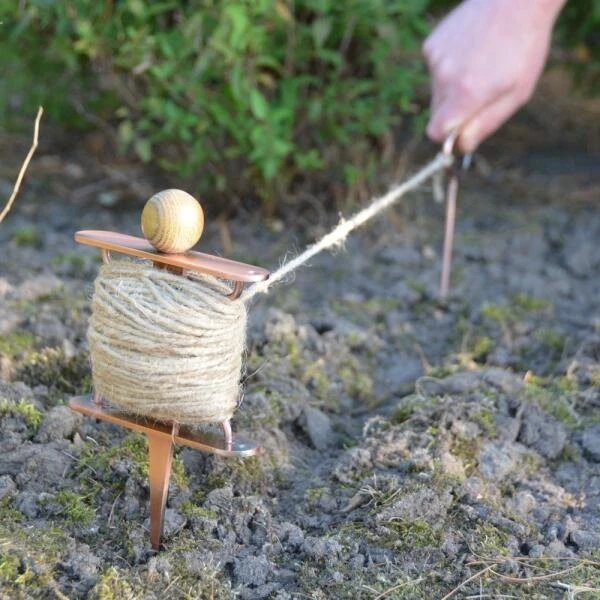 Zo werk je steeds in een rechte lijn, ook bijvoorbeeld bij de aanleg van graszoden. Bestaat uit 25 meter jute tuintouw op een spoel in verkoperd koolstofstaal met platte steker zodat die niet steeds doordraait bij het aanspannen van het touw met de verkoperde grondpin.
