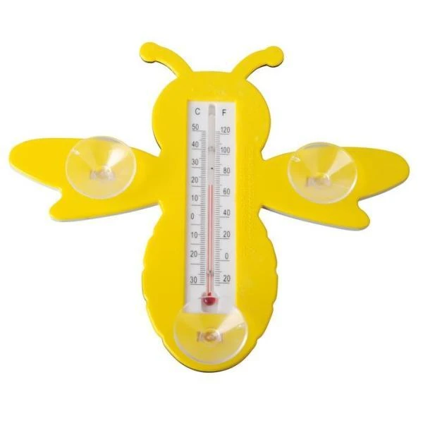 Een mooie en nuttige bij om tegen het raam aan te hangen! Deze leuke raamthermometer van Esschert design hecht zich vast aan de buitenzijde van jouw raam via de zuignappen die zich op de buik bevinden. Op de buikzijde is er eveneens een thermometer voorzien waardoor je de buitentemperatuur binnenshuis kunt aflezen.