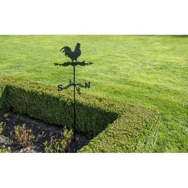 Zwarte metalen windwijzer met een trotse haan. De windhaan kan zo op een muurbeugel of op een tuinprikker en is zeer gemakkelijk te monteren. De hoogte van de windhaan op de prikker is ca. 120 cm.