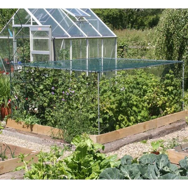 De kooi wordt compleet geleverd met aluminium buizen, verbindingsstukken en net. Het net beschermt de gewassen in de kooi tegen vlinders en vogels. Zo worden de jonge gewassen niet opgegeten door duiven en zitten de kolen niet onder de rupsen.