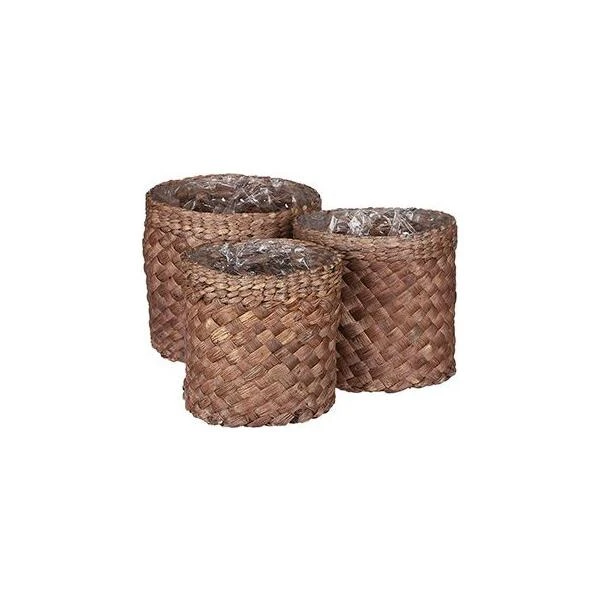 Deze set bloemenmandjes zijn vervaardigd uit gevlochten waterhyacint, een tropische plant die ook gebruikt wordt om waterwegen vrij te houden. Hierdoor zijn de manden uiterst geschikt voor binnengebruik. Kan buiten gebruikt worden bij zonnig weer.