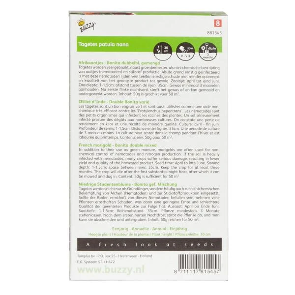 Tagetes (Tagetes patula nana) heeft een remmende werking (niet-chemische bestrijding tot wel 90%) op de activiteit van nematoden (aaltjes) en is bovendien een goede bodembemester.