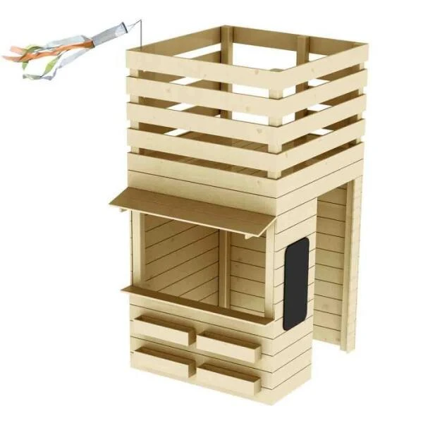 Het terras is toegankelijk via een stevige ladder en beveiligd door een omheining. De hoogte van het terras is 158 cm. Het speelhuis bevat geen deuren en is ruim met grote openingen zo kunnen kinderen gemakkelijk urenlang te spelen in de tuin.