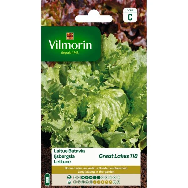 Ijsbergsla Great Lakes 118, deze variëteit is goed bestand tegen hitte en levert mooie kroppen die lang houdbaar zijn. Sla bevat vitamines (A, B, C en PP), mineralen (fosfor, magnesium en ijzer) en sporenelementen.