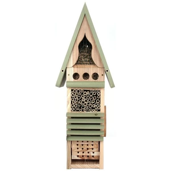 De bovenste kamer is gevuld met hooi en vormt de perfecte schuilgelegenheid voor allerhande insecten. De gezellige hooizolder beschermt hen tegen roofdieren! De insectenzone is gevuld met bamboepijpjes in verschillende diameters, de favoriete nestplaats voor verschillende solitaire bijen en enkele overwinterende insecten zoals lieveheersbeestjes en gaasvliegen.