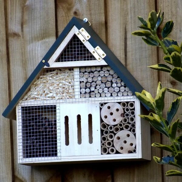Gebruiksklaar insectenhotel met zes kamers, volledig opgebouwd uit natuurlijke materialen. Elke kamer in dit insectenhotel heeft vele veilige hoeken en gaten, zij creëren het perfecte verblijf voor een grote variëteit aan insecten. Het hotel biedt bescherming en onderdak aan solitaire bijen, vlinders, gaasvliegen en lieveheersbeestejs als overwinterplaats, nestelplaat, voedselplaats en rustplaats.