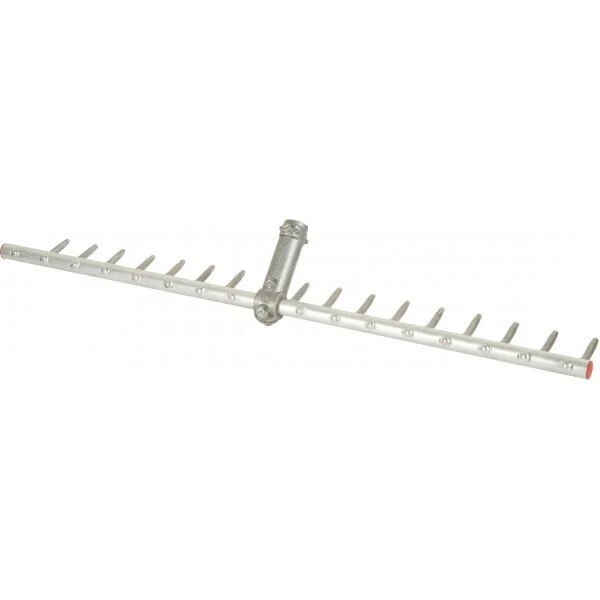De hark bestaat uit 17 aluminium tanden en past dankzij de stalen dul op elke houten steel.