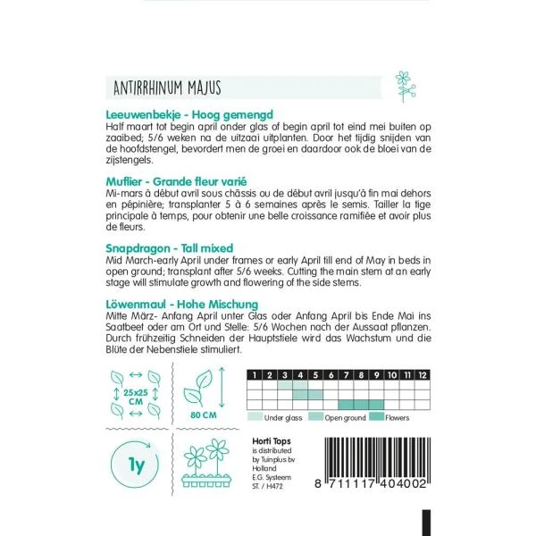 Gemengd zadenmengsel van hoge leeuwenbekjes in witte, gele, roze en rode bloeitinten. Deze éénjarige snijbloem is uitstekend in borders toe te passen en wordt redelijk hoog en breed.