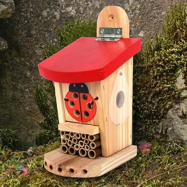 De onderste kamer is voorzien van bamboebuisjes voor het overwinteren van lieveheersbeestjes en andere insecten, alsook kan het dak open zodat je zelf nog natuurlijke materialen zoals stro en schors kan toevoegen en je een ‘huiselijk gevoel’ creëert.