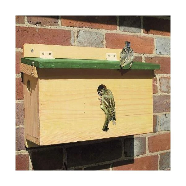 Huismussen zijn echte kolonievogels die graag bij elkaar broeden. Speciaal voor deze vogels werd een nestkast ontworpen waarin 3 koppeltjes tegelijk kunnen broeden. De huismussennestkast is voorzien van 3 verschillende invliegopeningen, 1 aan de voorzijde en 2 aan beide zijkanten. Het dak tilt op zodat je het na het broedseizoen kunt reinigen.