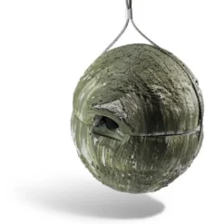 Deze bol in houtbeton zal bekleed worden met mos en veren en is zowel geschikt als nestplaats en als schuilplaats voor één van onze kleinste zangvogels.