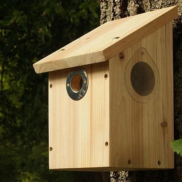 Duurzame houten nestkast met cameraclip en plexiraampje voor optimale camerabeelden. Deze houten nestbox is gemaakt uit duurzaam traaggroeiend hout. Dankzij het gebruik van traaggroeiende houtsoorten heeft deze volledig natuurlijke kast geen nood aan enige vorm van chemische behandeling.