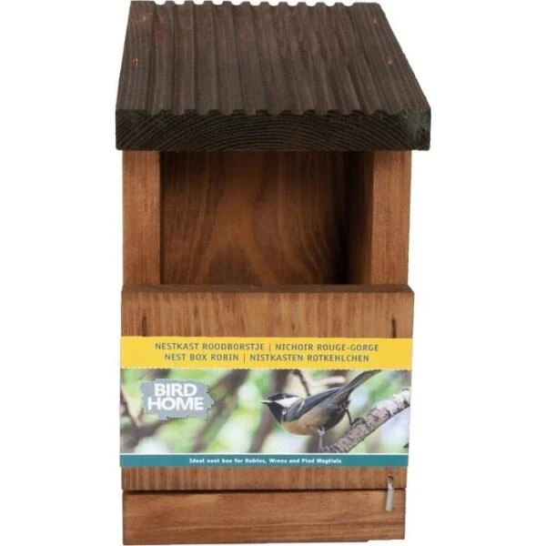 Een ideale nestkast voor roodborstjes, winterkoninkjes en witte kwikstaarten. Deze vogels zijn half holenbroeders en verkiezen een open constructie om hun nest in te bouwen.