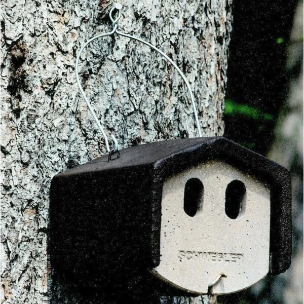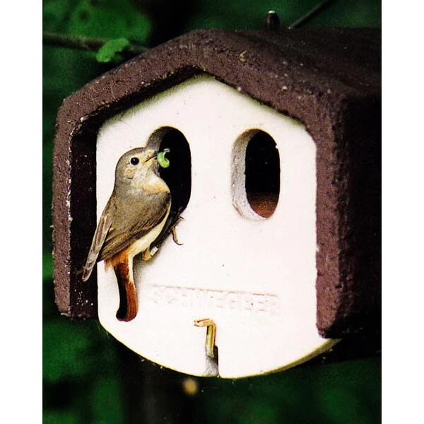 Nestkast in houtbeton met twee invliegopeningen, Ø 30 x 50 mm. De twee ovale invliegopeningen zorgen voor voldoende lichtinval gezien de diepte van deze nestkast. Door de hoeveelheid licht zal het nest diep en achterin de kast, voorbij de houten roofdierbescherming, worden gebouwd.
