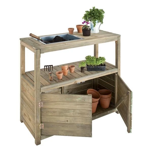 Grenenhouten oppottafel met handige opbergkast. Deze mooie werktafel heeft een verzinkte werkbak in het werkblad en is gemaakt uit duurzaam geïmpregneerd grenenhout.