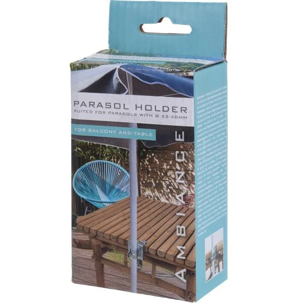 Geen plaats voor een zware parasolvoet op jouw balkon of (dak)terras? Met deze houder zet je jouw parasol handig vast aan de reling van een balkon of aan een tuintafel. Door zijn stevige uitvoering, kan de parasol ook wat wind aan.