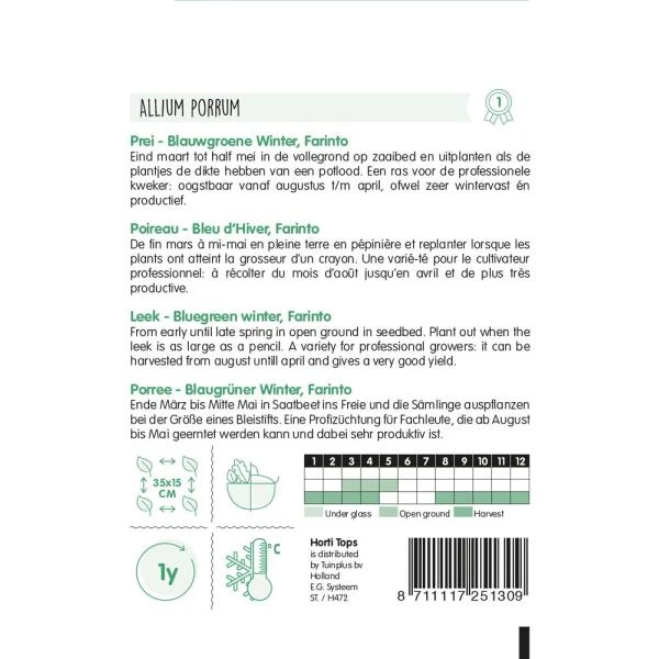 Eind maart tot half mei in de volle grond zaaien en uitplanten als de planten de dikte hebben van een potlood. Dit is echt een ras voor de professionele kweker. Winterprei, zeer wintervast en produktief.