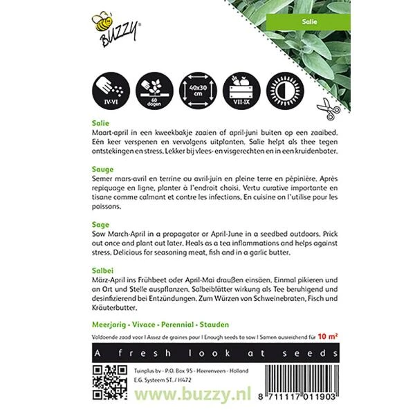 Salie kan het beste worden gezaaid op een zonnige, liefst beschut plaatsje in de tuin. De grond moet kalkrijk en goed gedraineerd zijn. Kortom, in voedzame, droge grond staat salie zeker op zijn plaats. Ook in een vaste planten border komt salie goed tot zijn recht, dit dankzij de groengrijze kleur van de plant met daar bovenop in de zomer nog de mooie paarsblauwe bloemen. Salie is ook gemakkelijk te kweken in potten op het terras. Zaaien kan in maart onder glas. Verspenen in potjes en eind mei uitplanten in de vollegrond. Salie is weinig onderhevig aan ziekten of insecten en daardoor een gemakkelijk te telen plant.