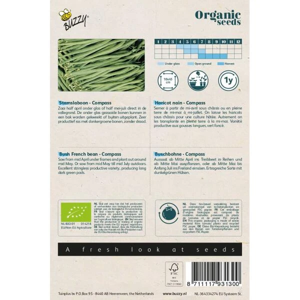 Kweek zelf bonen op een biologische manier en start met biologische zaden. Stamslabonen Compass kunnen gezaaid worden vanaf half april onder glas of vanaf half mei tot juli direct in de volle grond. Onder glas gezaaide bonen kunnen in een bak gekweekt of buiten uitgeplant worden. Het is een zeer productief ras met donkergroene bonen zonder draad.