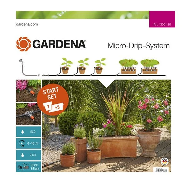 De GARDENA Micro-Drip-System start set M voor bloempotten bevat alle componenten voor een zorgeloze en waterbesparende besproeiing van 7 bloempotten en 3 potplanten op balkon en terras.