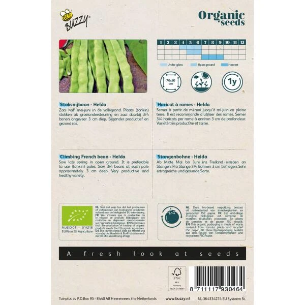 Kweek zelf bonen op een biologische manier en start met biologische zaden. Stokslabonen Helda kunnen in de volle grond gezaaid worden vanaf half mei tot juli.