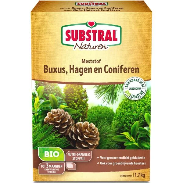 Substral Nuturen meststof uitermate geschikt voor de meest voorkomende hagen zoals buxus, liguster, berberis en haagbeuk. Bevat een hoog gehalte aan magnesium dat zorgt voor groenere blaadjes.Verbetert de bodemstructuur door een hoog gehalte aan organische stoffen en bevordert een dichte, gesloten groei.