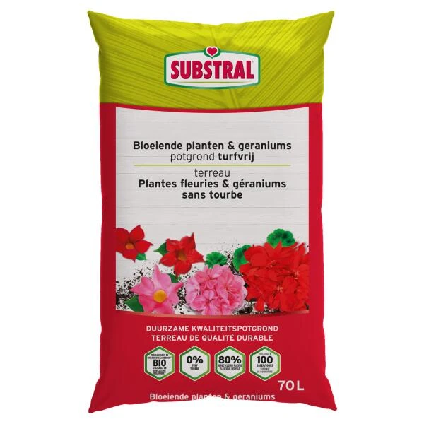 De potgrond is speciaal ontwikkeld voor geraniums en andere éénjarige soorten zoals surfinia’s, begonia’s, petunia’s, salvia’s, vlijtige liesjes, viooltjes,… in bloembakken en potten.