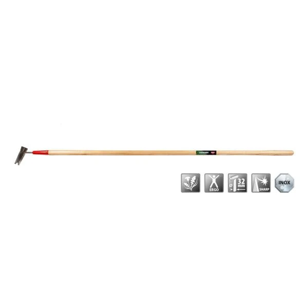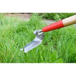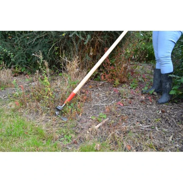 Dankzij de punt met inkeping kan je paardenbloemen of ander onkruid met penwortel snel verwijderen. Ook moeilijk bereikbaar onkruid worden makkelijk bereikbaar. Draai de hak 180° en gebruik hem om afgehakt onkruid bij elkaar te harken.
