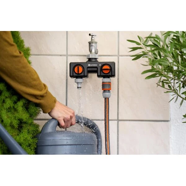 Met de GARDENA 2-weg-waterverdeler sluit je gelijktijdig twee accessoires aan op één kraan. De uitgangen zijn traploos regelbaar. Op de verdeler kunnen bijvoorbeeld twee GARDENA besproeiingscomputers of watertimers worden aangesloten.