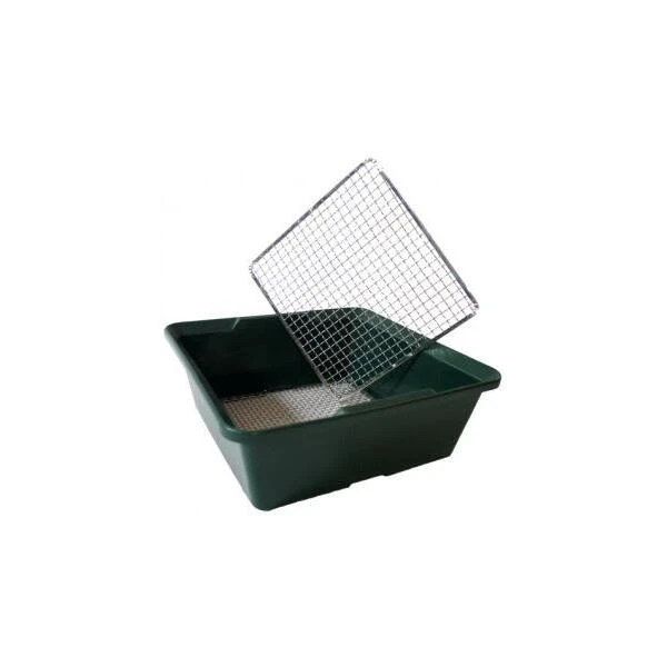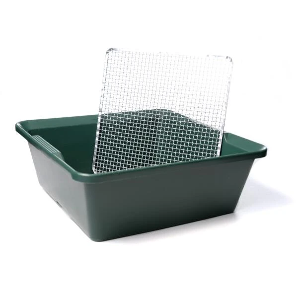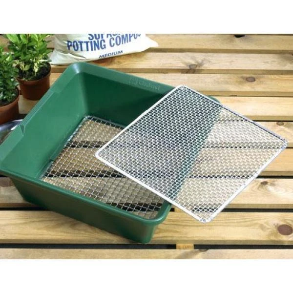 Praktische en zeer handige diepe zeef compleet geleverd met twee verwisselbare netten. Rasternet met fijne mazen van 6 mm voor bv. zaaiwerk en een net met grovere mazen 12 mm om bijvoorbeeld compost uit te zeven.