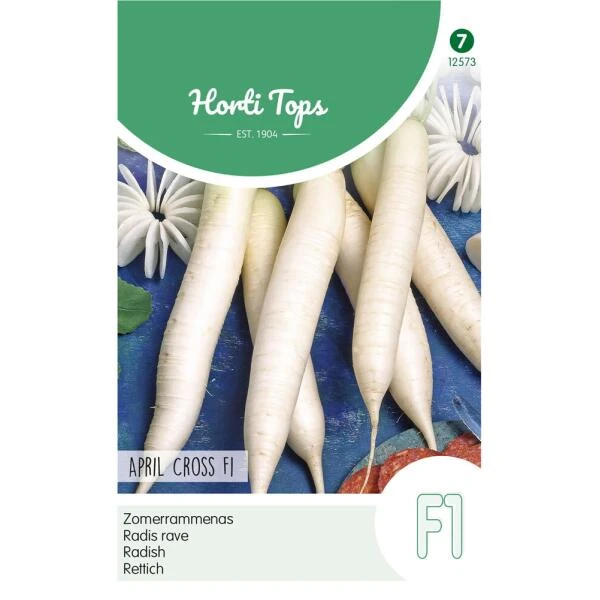 Vanaf half maart tot half april onder glas zaaien en in volle grond tot half augustus. Zomerramenas April Cross F1 is een japanse Rettich hybride, goed van smaak en wordt niet snel voos.