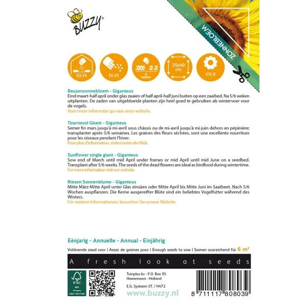 Zonnebloem Gigant. De uitgebloeide bloemen zijn gedroogd zeer decoratief. De zaden zijn geschikt als wintervoer voor vogels.